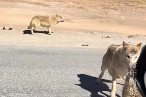 男子投喂可可西里网红狼,前狼没吃到被同伴咬尾拖回
